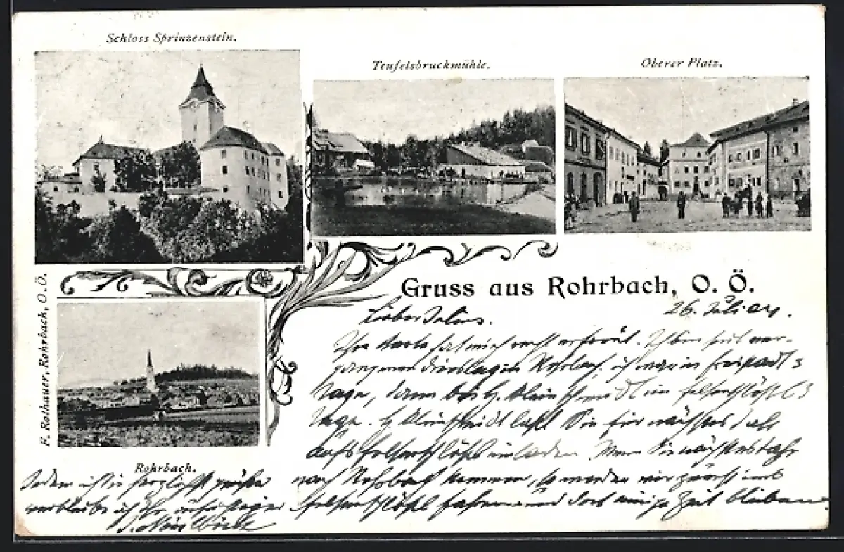 AK Rohrbach /O. Ö., Schloss Sprinzenstein, Teufelsbruckmühle, Oberer Platz