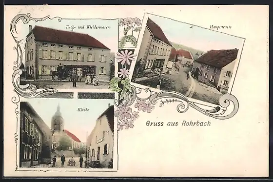 AK Rohrbach, Tuch- und Kleiderwarengeschäft, Hauptstrasse und Kirche