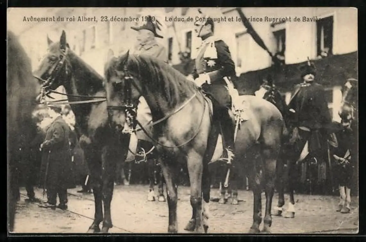 AK Roi Albert, 23 decembre 1909, Le du de Connaught et le prince Ruprecht de Baviere, König von Belgien auf Pferd