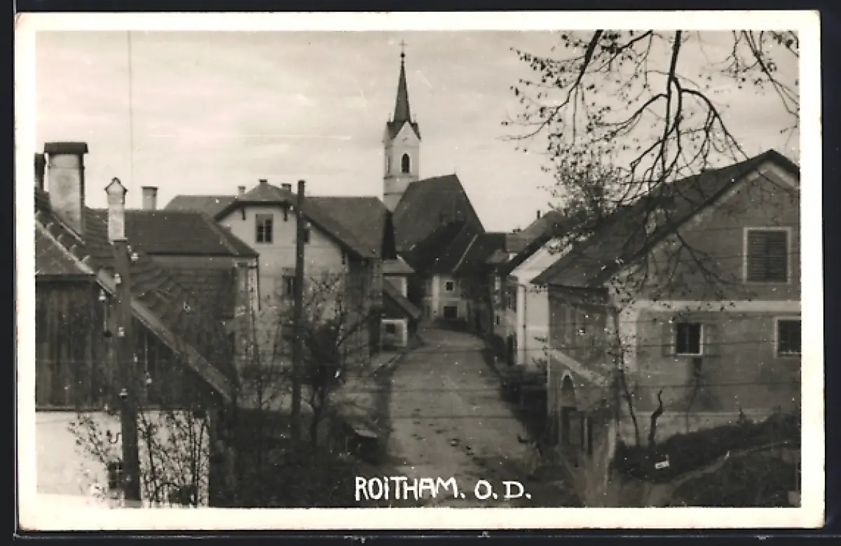 AK Roitham /O. D., Strassenpartie mit Kirche
