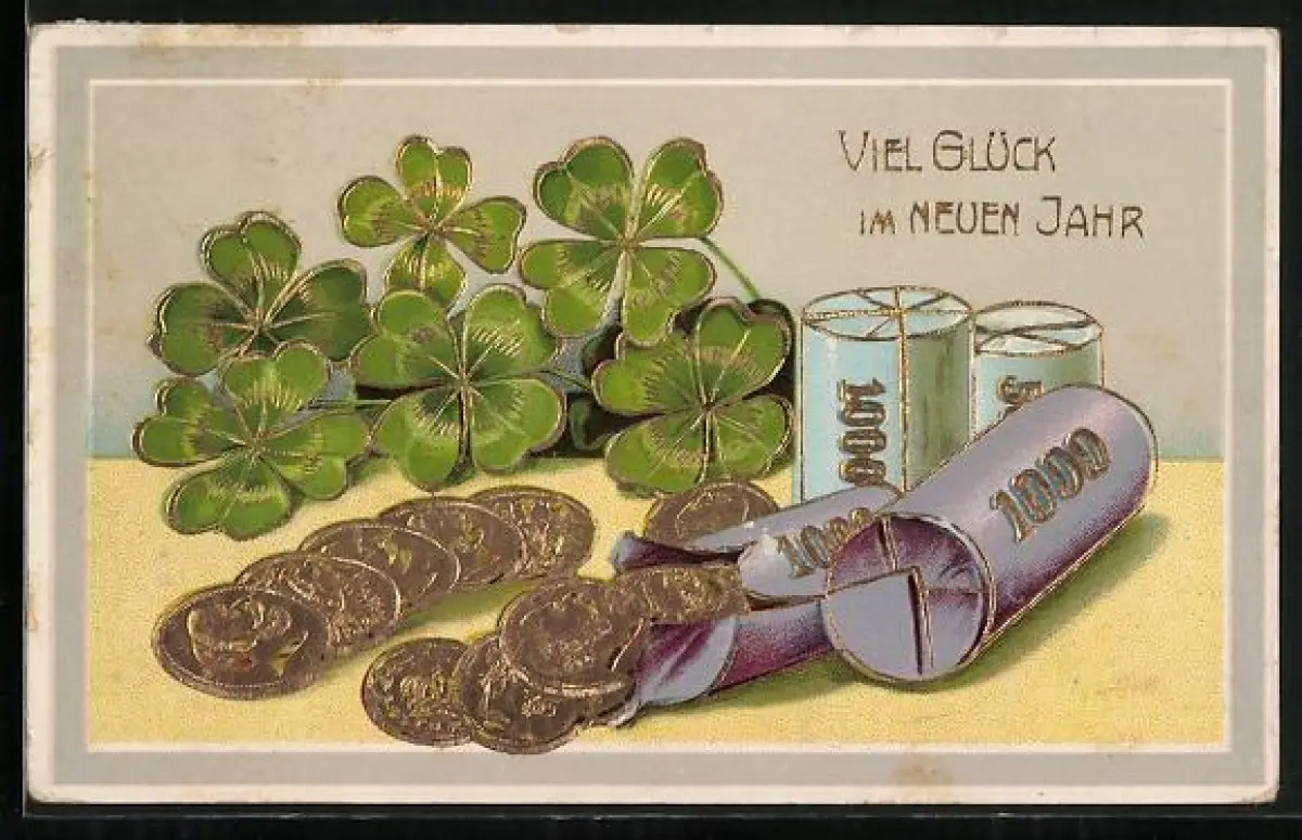 AK Rollen aus Geldmünzen mit Kleeblättern und Neujahrsgruss
