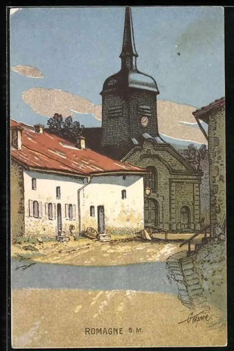 AK Romagne /S.-M., Vue de l`église et des maisons du village