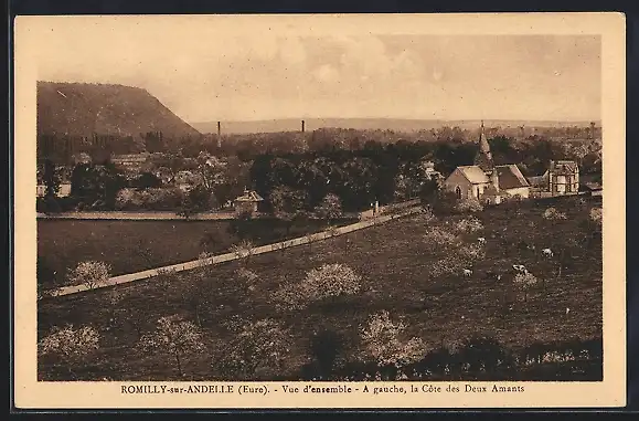AK Romilly-sur-Andelle, Vue d`ensemble, À gauche, la Côte des Deux Amants