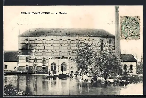 AK Romilly-sur-Seine, Le Moulin et la rivière calme en avant-plan