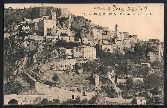AK Roquebrune, Vue de la Route de la Corniche et du village perché