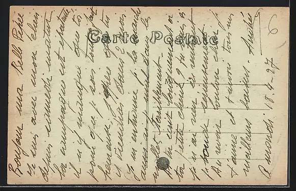Personenbezogene Daten auf der Rückseite der Karte wurden durch blauen Textmarker unkenntlich gemacht. Die blauen Stellen sind auf die Vorderseite durchgeweicht und wirken sich negativ auf das Postkartenfoto aus