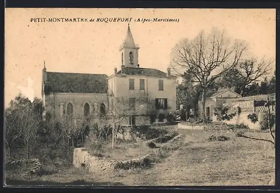 AK Roquefort, Église et jardin de Petit-Montmartre dans un cadre champêtre