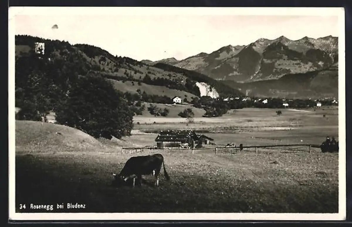 AK Rosenegg b. Bludenz, Ortspartie und Kuh auf der Weide