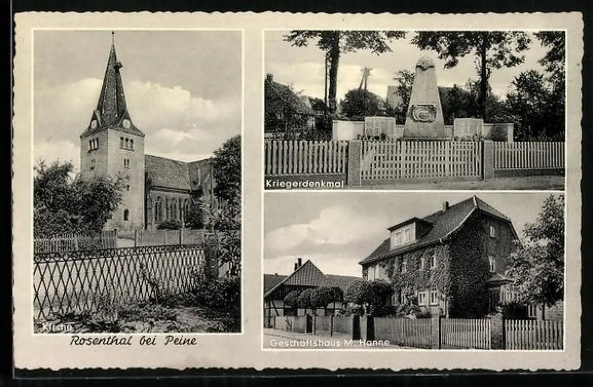 AK Rosenthal bei Peine, Geschäftshaus M. Hanne, Kirche, Kriegerdenkmal