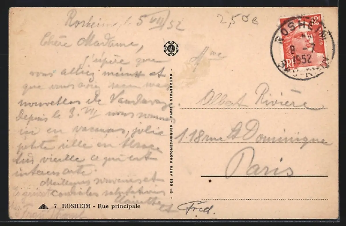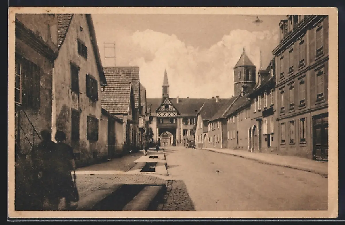 AK Rosheim, Rue principale avec maisons à colombages et clocher au fond