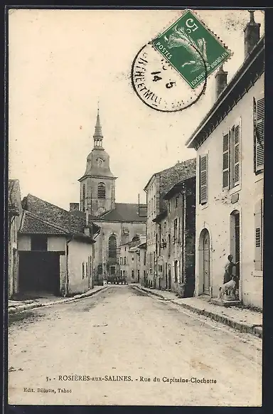 AK Rosières-aux-Salines, Rue du Capitaine-Clodette et l`église en arrière-plan