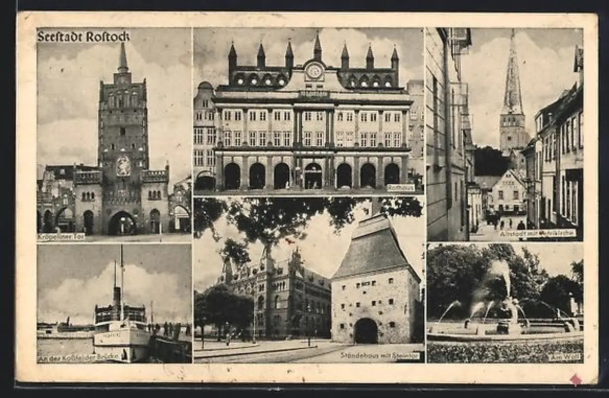 AK Rostock, Kröpeliner Tor, Rathaus, Ständehau, Springbrunnen