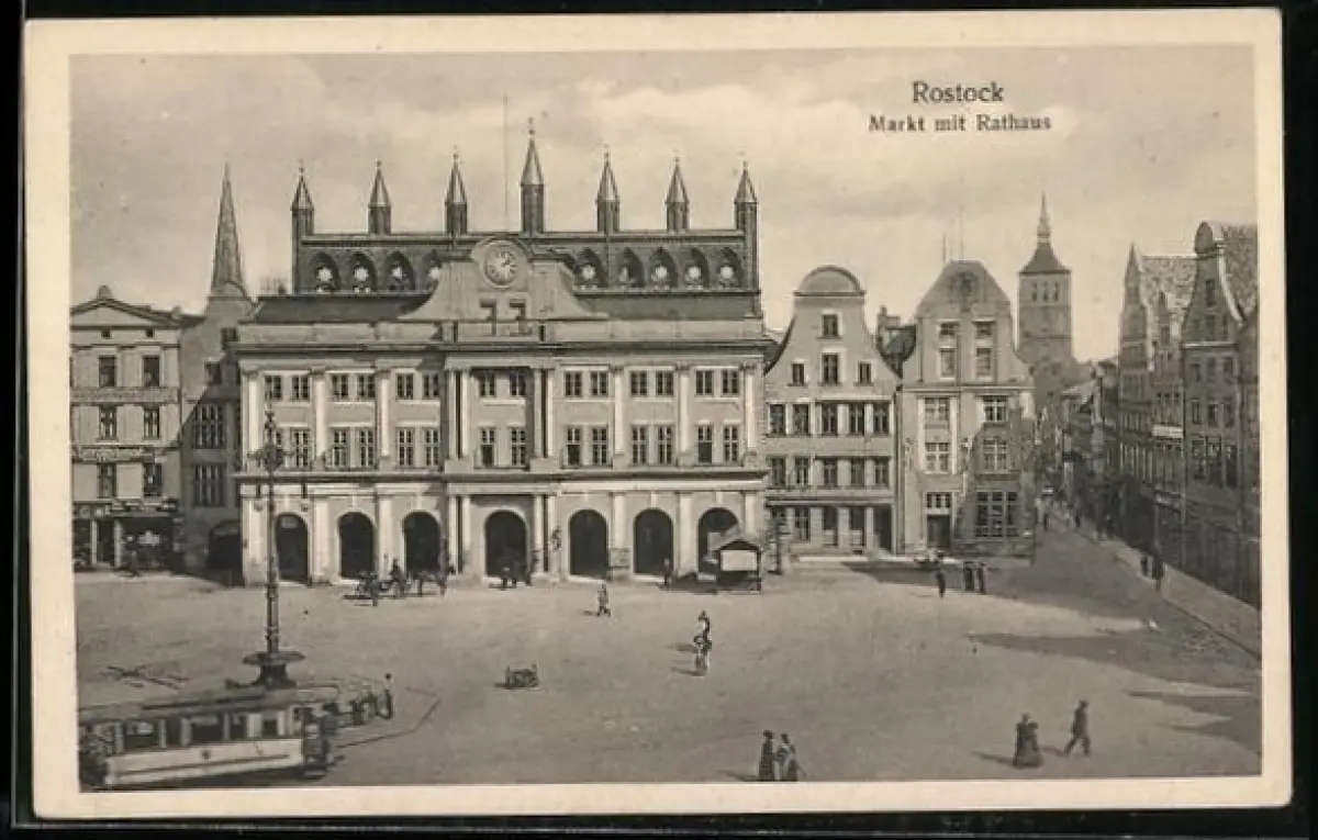 AK Rostock, Markt mit Geschäften und Rathaus, Strassenbahn