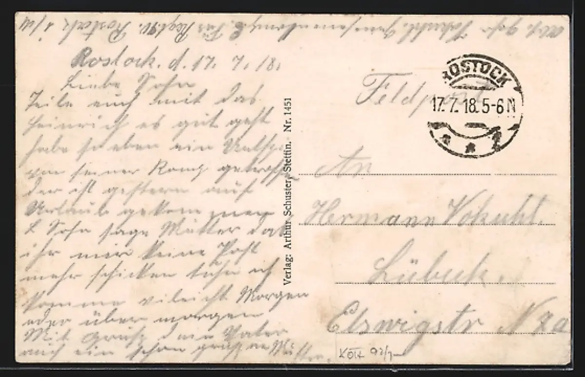 Personenbezogene Daten auf der Rückseite der Karte wurden durch blauen Textmarker unkenntlich gemacht. Die blauen Stellen sind auf die Vorderseite durchgeweicht und wirken sich negativ auf das Postkartenfoto aus