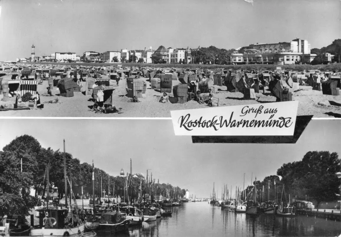 AK, Rostock Warnemünde, zwei Abb., Strand belebt und Alter Strom, 1965