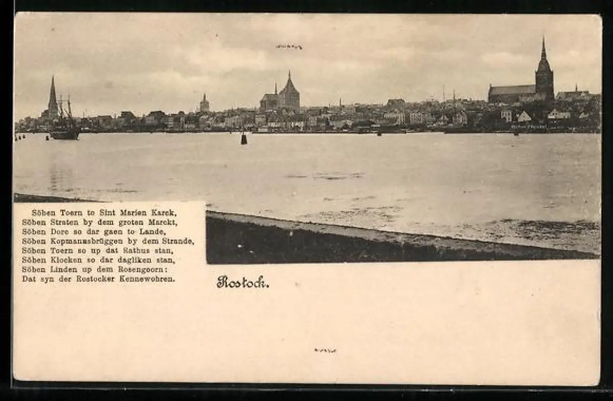 AK Rostock, Wasserblick auf die Stadt mit Kirchtürmen und Rathaus