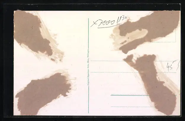 Personenbezogene Daten auf der Rückseite der Karte wurden durch blauen Textmarker unkenntlich gemacht. Die blauen Stellen sind auf die Vorderseite durchgeweicht und wirken sich negativ auf das Postkartenfoto aus