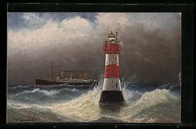AK Roter Sand Leuchtturm wird von Wellen umtost, Passagierschiff am Horizont