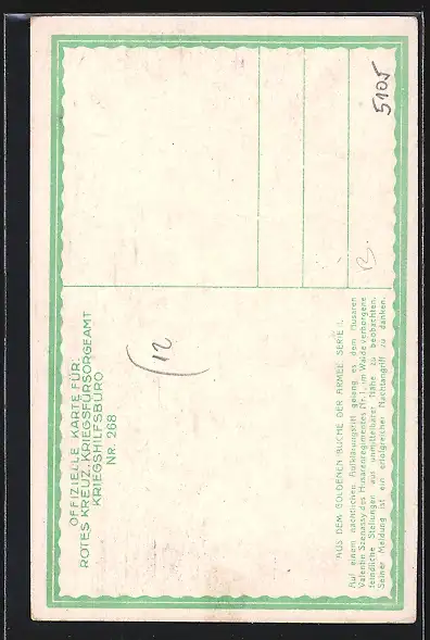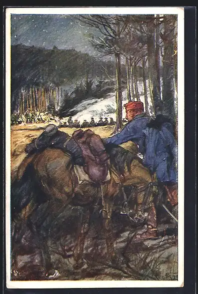 AK Rotes Kreuz Nr. 268: Husar Valentin Szenassy des Husarenregimentes Nr. 1 beobachtet im Walde verborgene..., Kriegsfür
