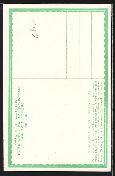 AK Rotes Kreuz Nr. 268: Husar Valentin Szenassy des Husarenregimentes Nr. 1 beobachtet im Walde verborgene..., Kriegsfür