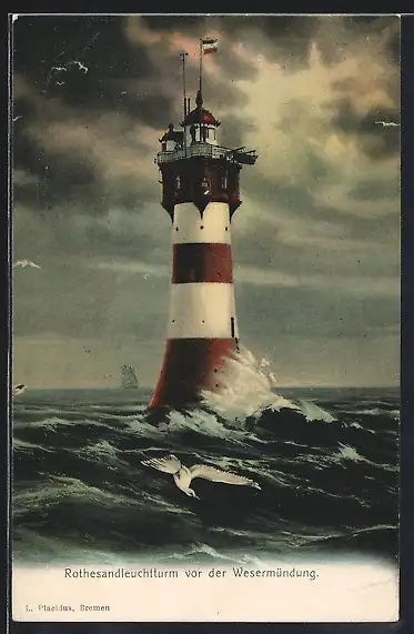 AK Rothesandleuchtturm vor der Wesermündung bei unruhiger See