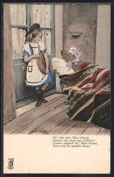 AK Rotkäppchen mit dem als Grossmutter verkleideten Wolf im Bett