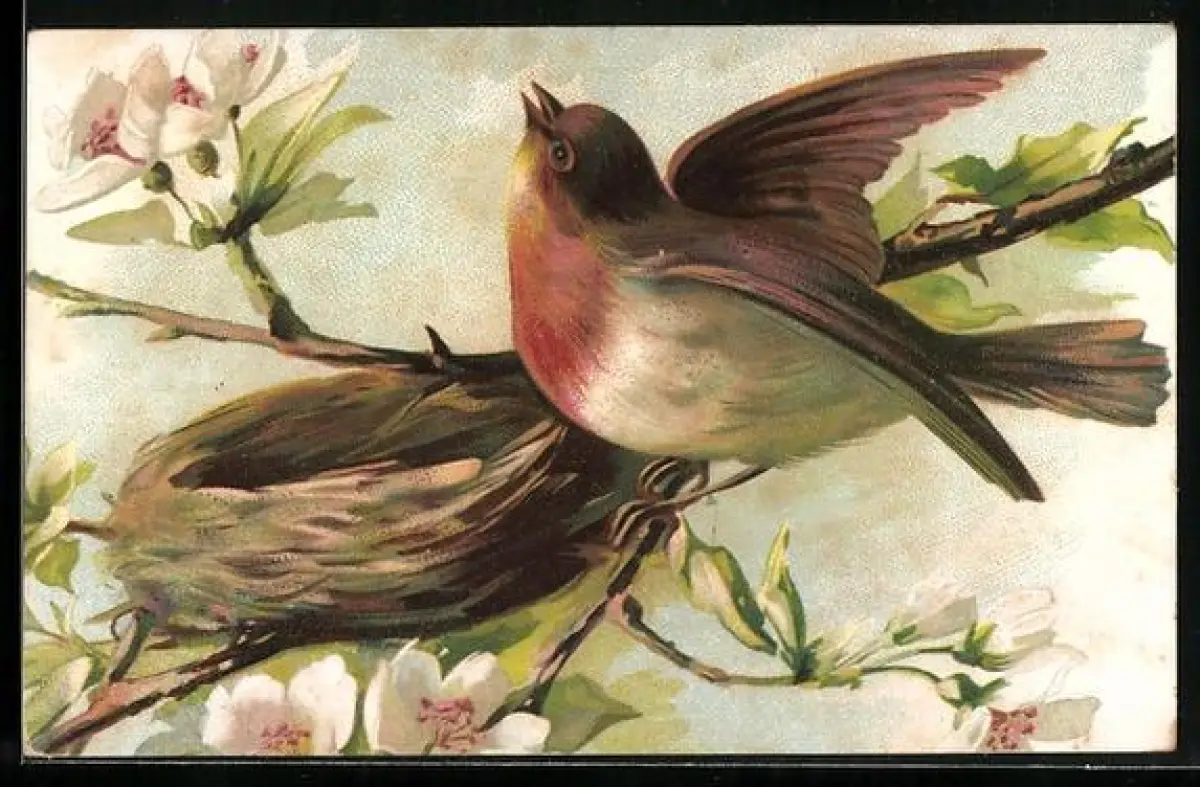 AK Rotkehlchen am Nest zwischen blühenden Zweigen