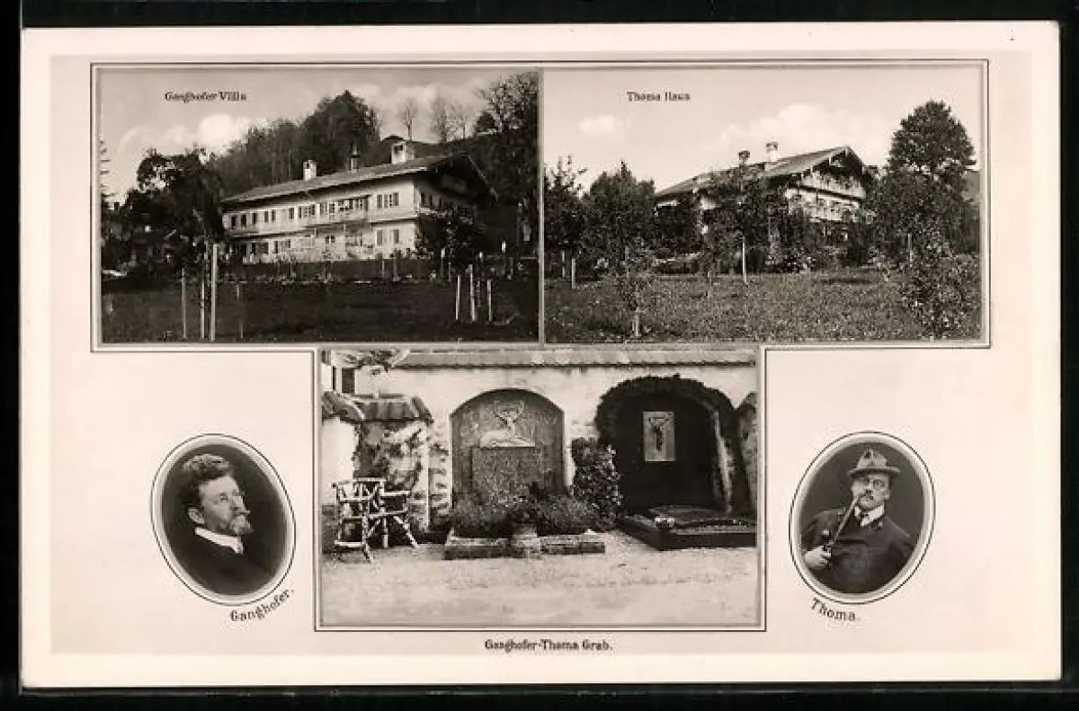 AK Rottach am Egernsee, Ganghofer u. Thoma: Portraits, Häuser, Gräber