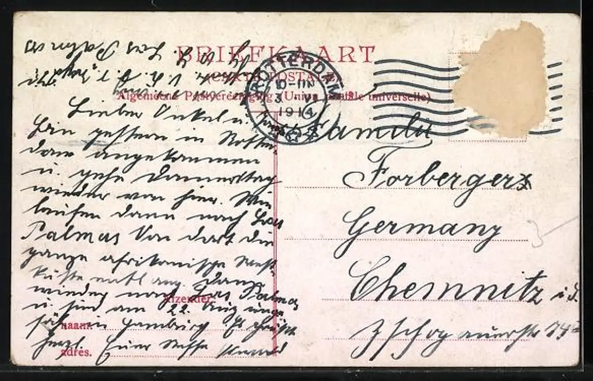 gelaufen 1914, Briefmarke entfernt, rückseitig Oberflächenschaden, guter Zustand