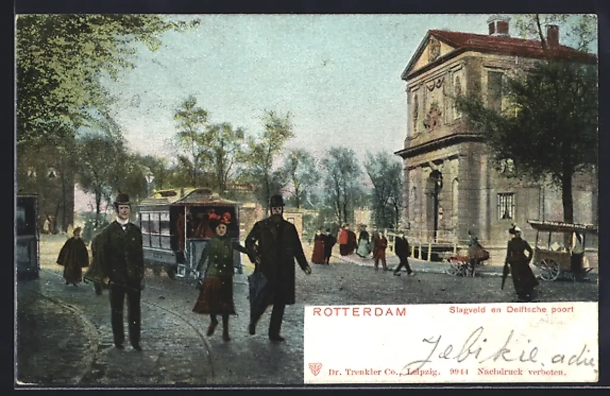 AK Rotterdam, Slagveld en Delftsche poort, Gebäudeansicht mit Strassenbahn und Fussgängern