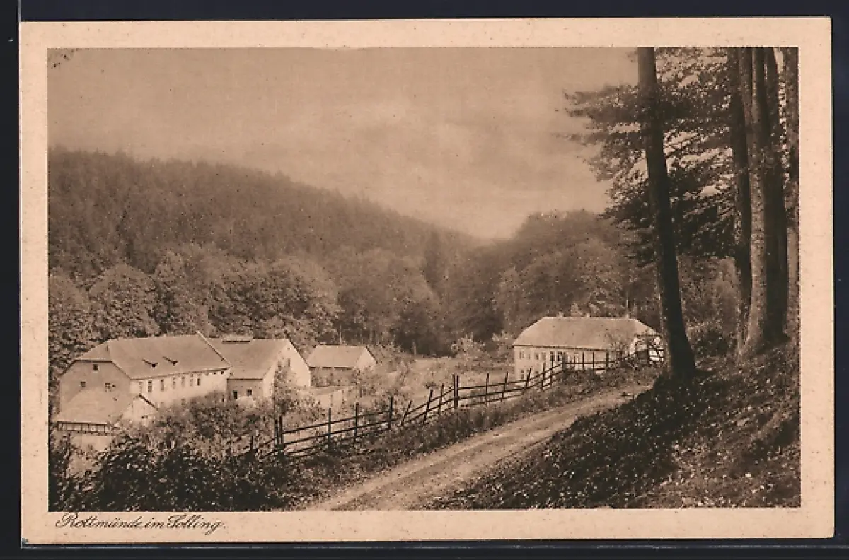 AK Rottmünde im Solling, Wegpartie am Wald mit Blick auf Ort