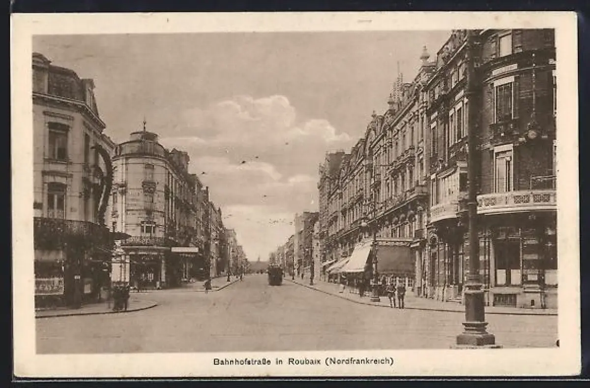 AK Roubaix, Bahnhofstrasse mit Geschäften, Strassenbahn