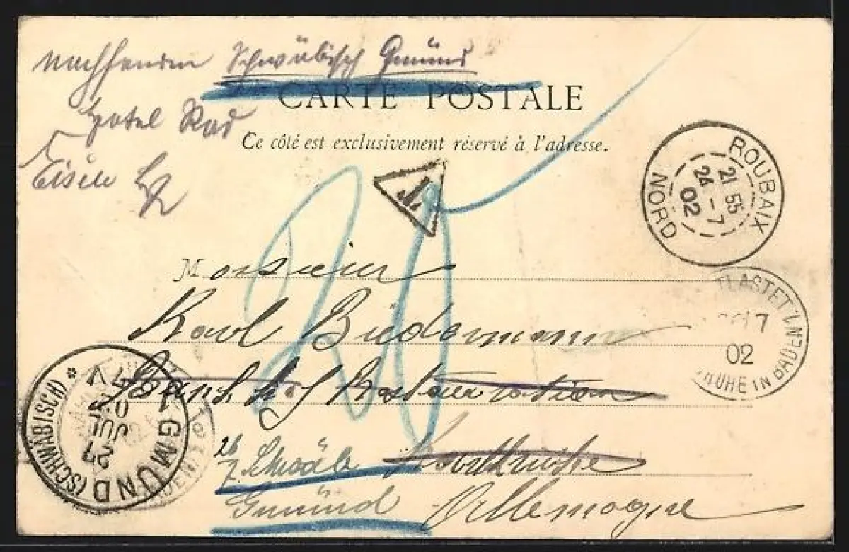 gelaufen 1902, Eckknicke li. unten, Bugspuren re. oben u. unten, guter Zustand
