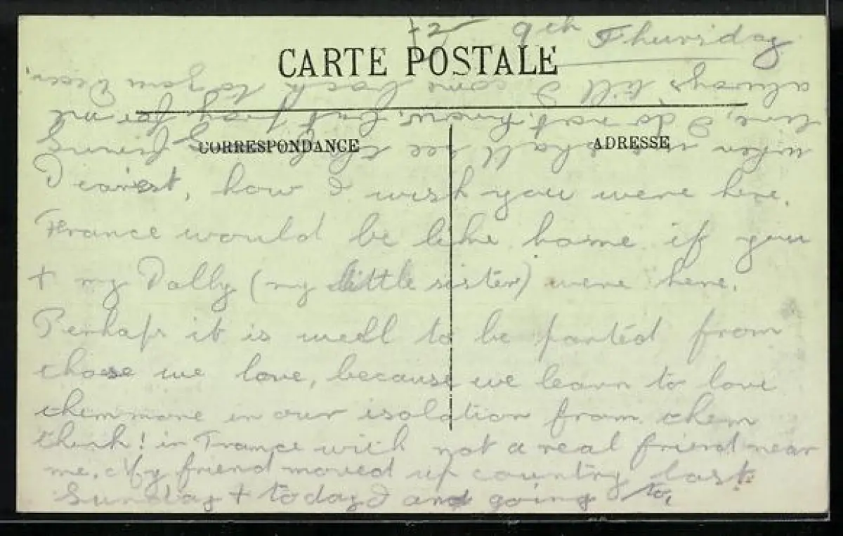 Personenbezogene Daten auf der Rückseite der Karte wurden durch blauen Textmarker unkenntlich gemacht. Die blauen Stellen sind auf die Vorderseite durchgeweicht und wirken sich negativ auf das Postkartenfoto aus