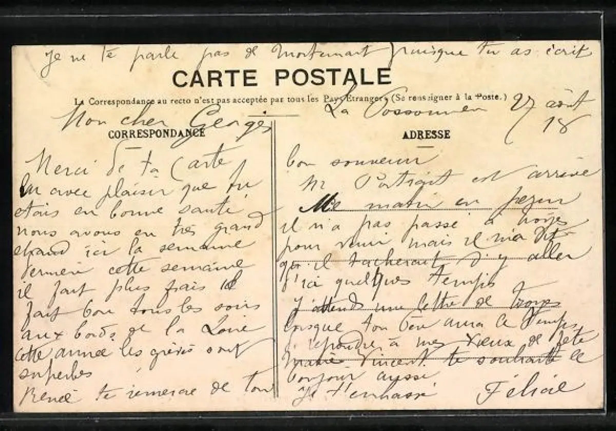 Personenbezogene Daten auf der Rückseite der Karte wurden durch blauen Textmarker unkenntlich gemacht. Die blauen Stellen sind auf die Vorderseite durchgeweicht und wirken sich negativ auf das Postkartenfoto aus