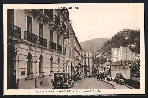 AK Royat, Boulevard Bazin avec voitures et vue sur les collines