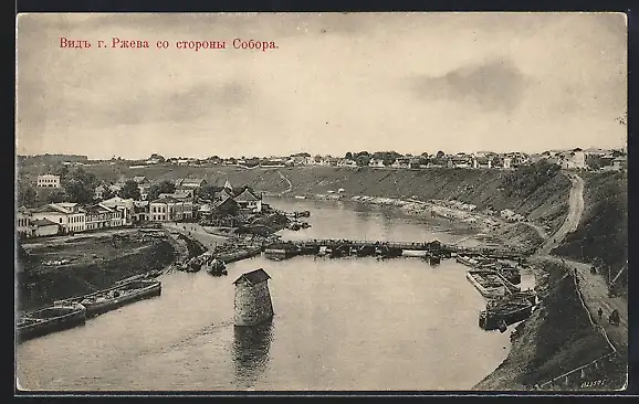 AK Rschew, Blick auf die Stadt und Fluss mit zerfallener Brücke