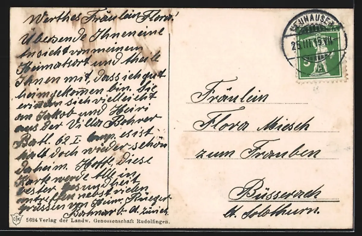Personenbezogene Daten auf der Rückseite der Karte wurden durch blauen Textmarker unkenntlich gemacht. Die blauen Stellen sind auf die Vorderseite durchgeweicht und wirken sich negativ auf das Postkartenfoto aus