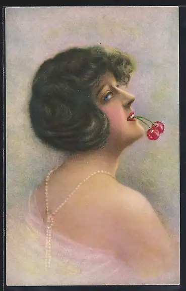 AK Rückenansicht von Frau mit Kirschen im Mund