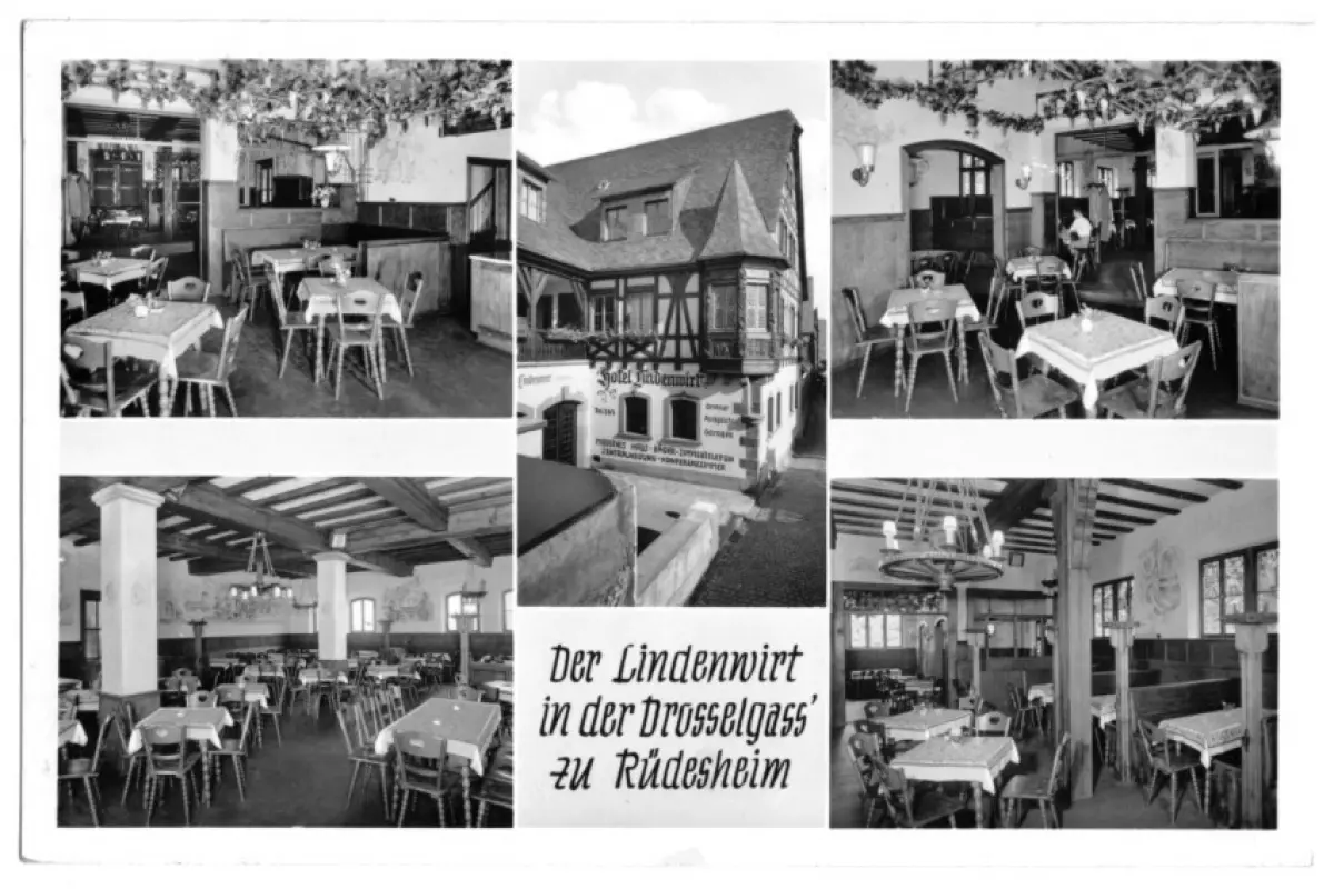 Ansichtskarte Rüdesheim Rhein Lindenwirt in der Drosselgass', fünf Abb. Erhaltung I-II postalisch gelaufen, gestempelt: (16) Rüdesheim, 10.12.53 Verlag: Schöning & Co., Lübeck