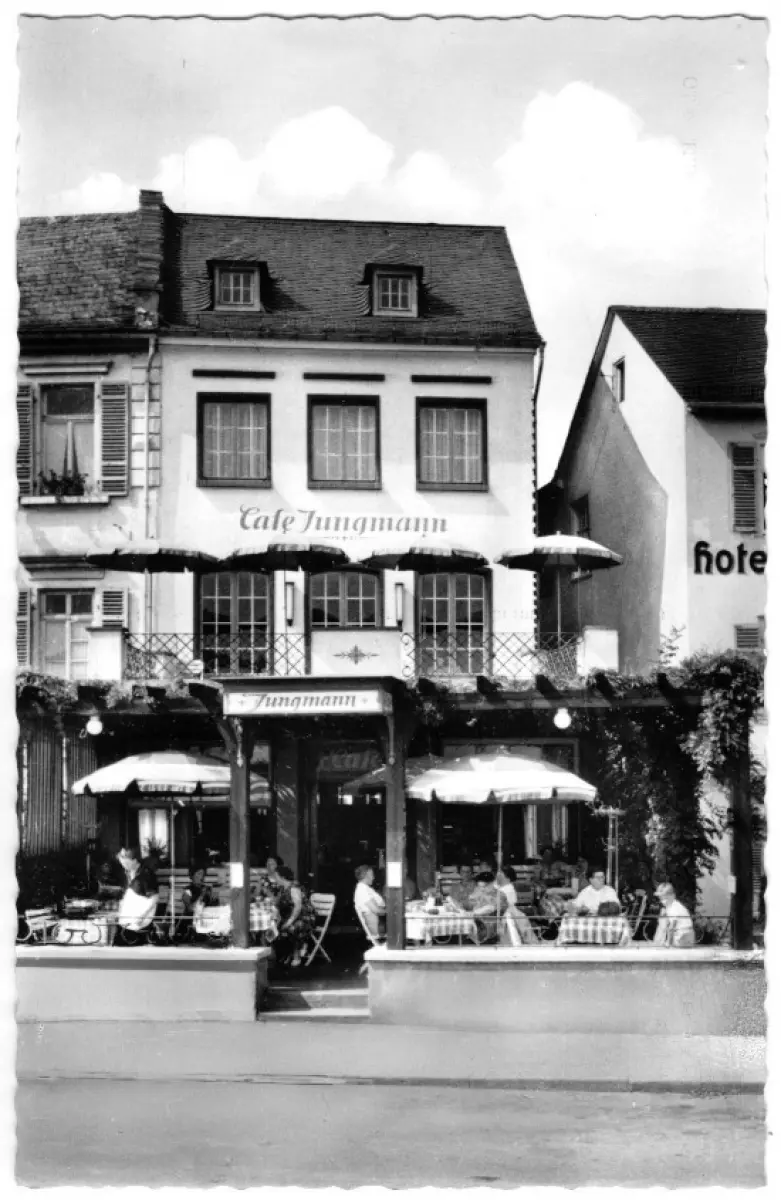 Ansichtskarte Rüdesheim am Rhein Conditorei Jungmann mit Terrasse, belebt, Rheinstr. 26 Erhaltung I-II postalisch gelaufen, ungestempelt: [4.9.72] Verlag: Foto - Rommmeiss, Rüdesheim Rhein