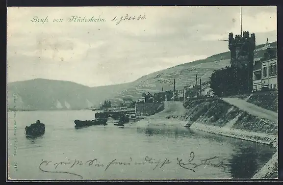 AK Rüdesheim am Rhein, Uferpartie mit Bootsanleger