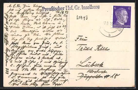 alte Ansichtskarte, gelaufen 1943, Eckknick li. unten, Bugspuren li. unten, guter Zustand