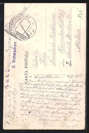 Personenbezogene Daten auf der Rückseite der Karte wurden durch blauen Textmarker unkenntlich gemacht. Die blauen Stellen sind auf die Vorderseite durchgeweicht und wirken sich negativ auf das Postkartenfoto aus