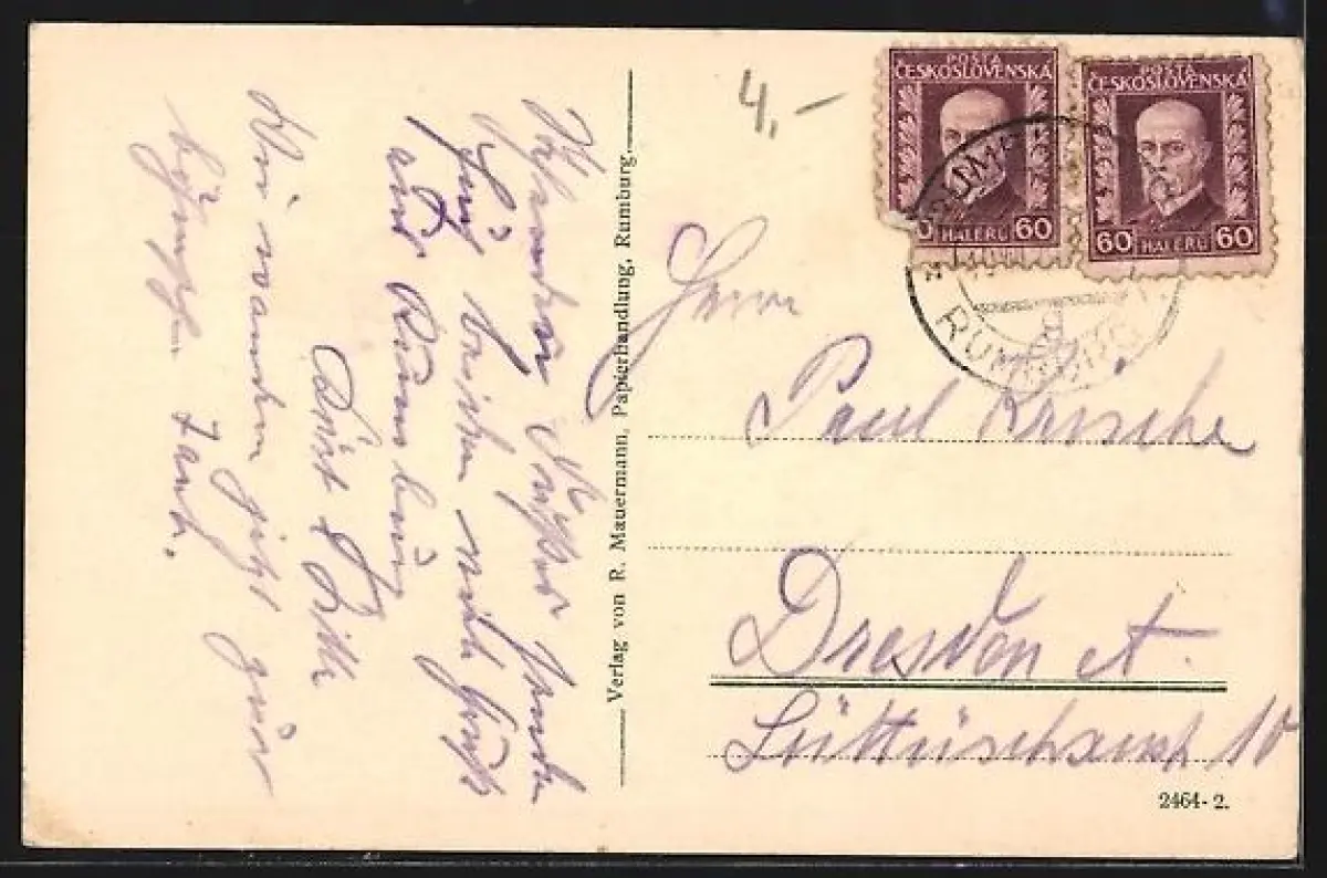 Personenbezogene Daten auf der Rückseite der Karte wurden durch blauen Textmarker unkenntlich gemacht. Die blauen Stellen sind auf die Vorderseite durchgeweicht und wirken sich negativ auf das Postkartenfoto aus