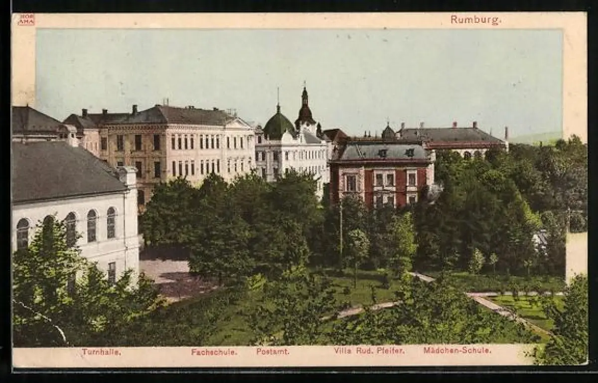AK Rumburg / Rumburk, Ortspartie mit Turnhalle, Fachschule, Postamt, Villa Rud. Pfeifer, Mädchen-Schule