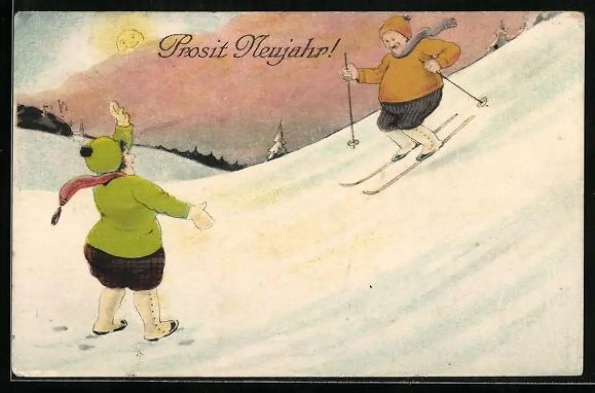 AK Rundliches Paar vergnügt sich auf Skiern, Neujahrsgruss