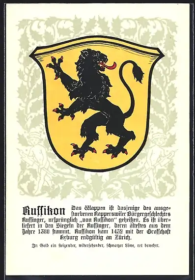 AK Russikon, Wappen auf Ilex-Ornamenten, Kinderfiguren, Info-Text