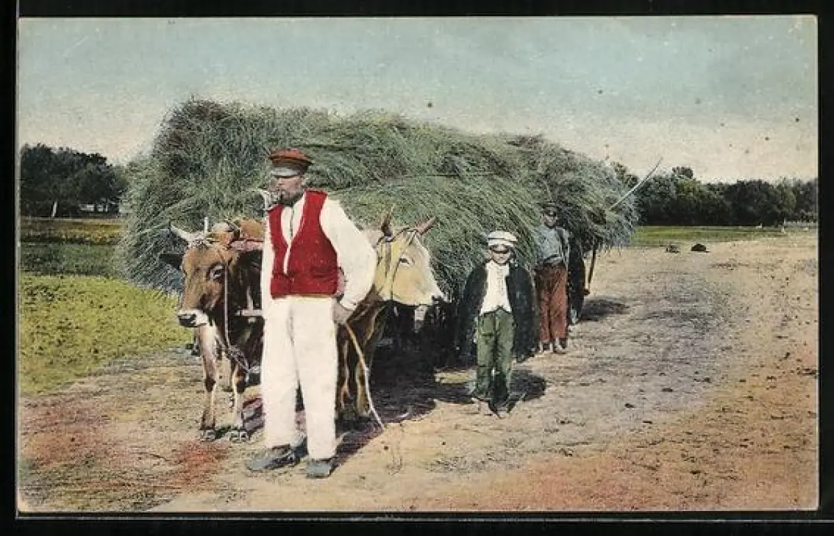 AK Russische Bauern transportieren Heu mit dem Ochsenfuhrwerk