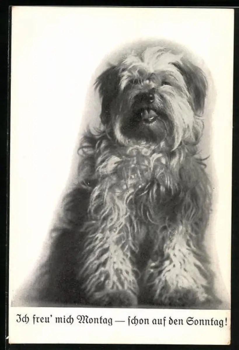AK Russischer Steppenhund mit fluffigem Fell, Ich freu` mich Montag- schon auf den Sonntag